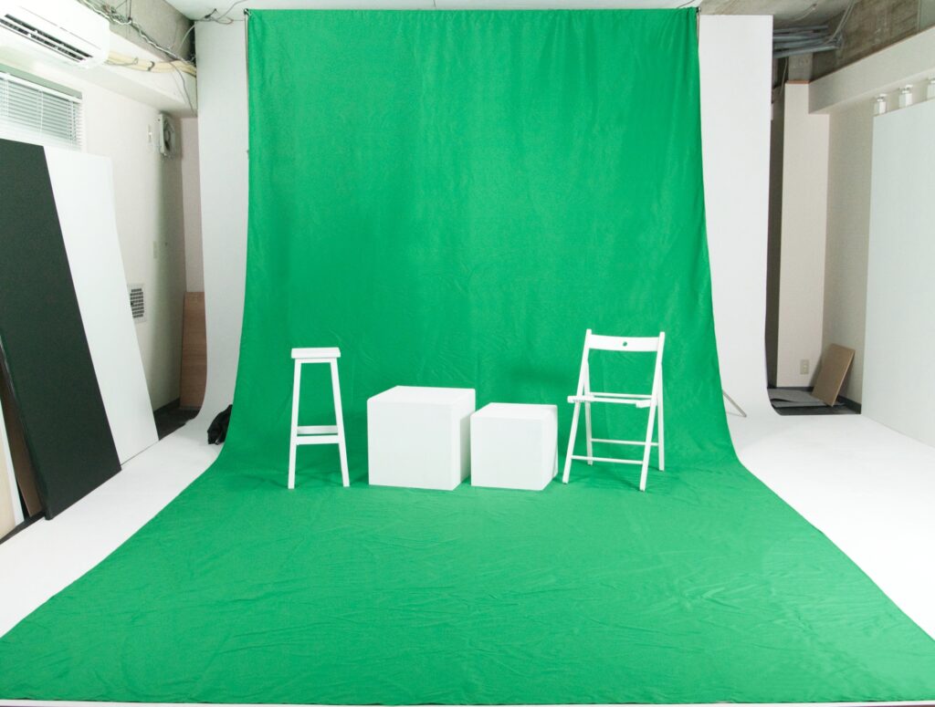 グリーンバックを背景としたセッティングが可能。本郷店には専用背景ポールにより白ホリ壁との隙間なく、空間を有効利用することができます。