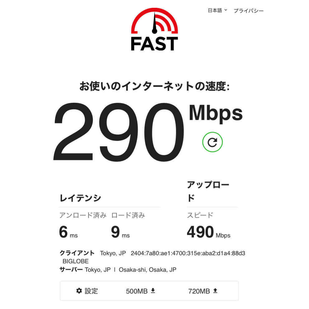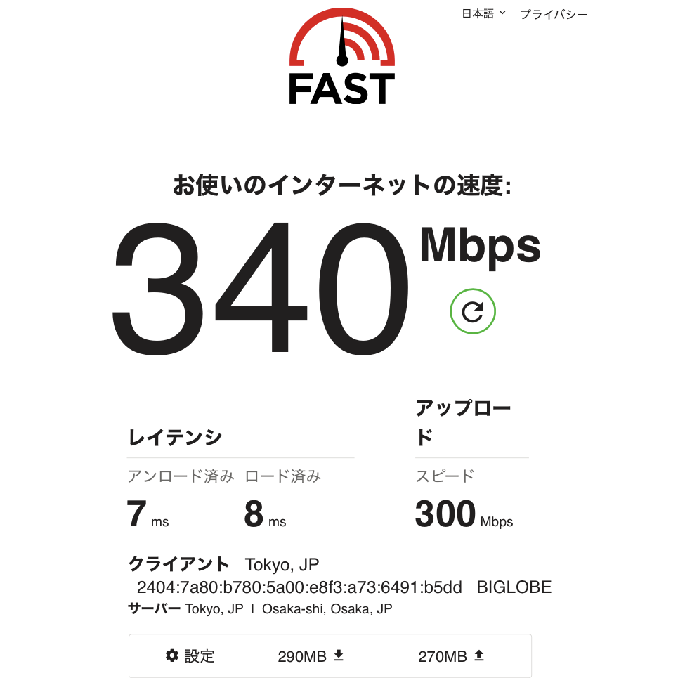 WiFiはBiglobe光1Gbpsの回線、約300Mbps(実測値)となっております。